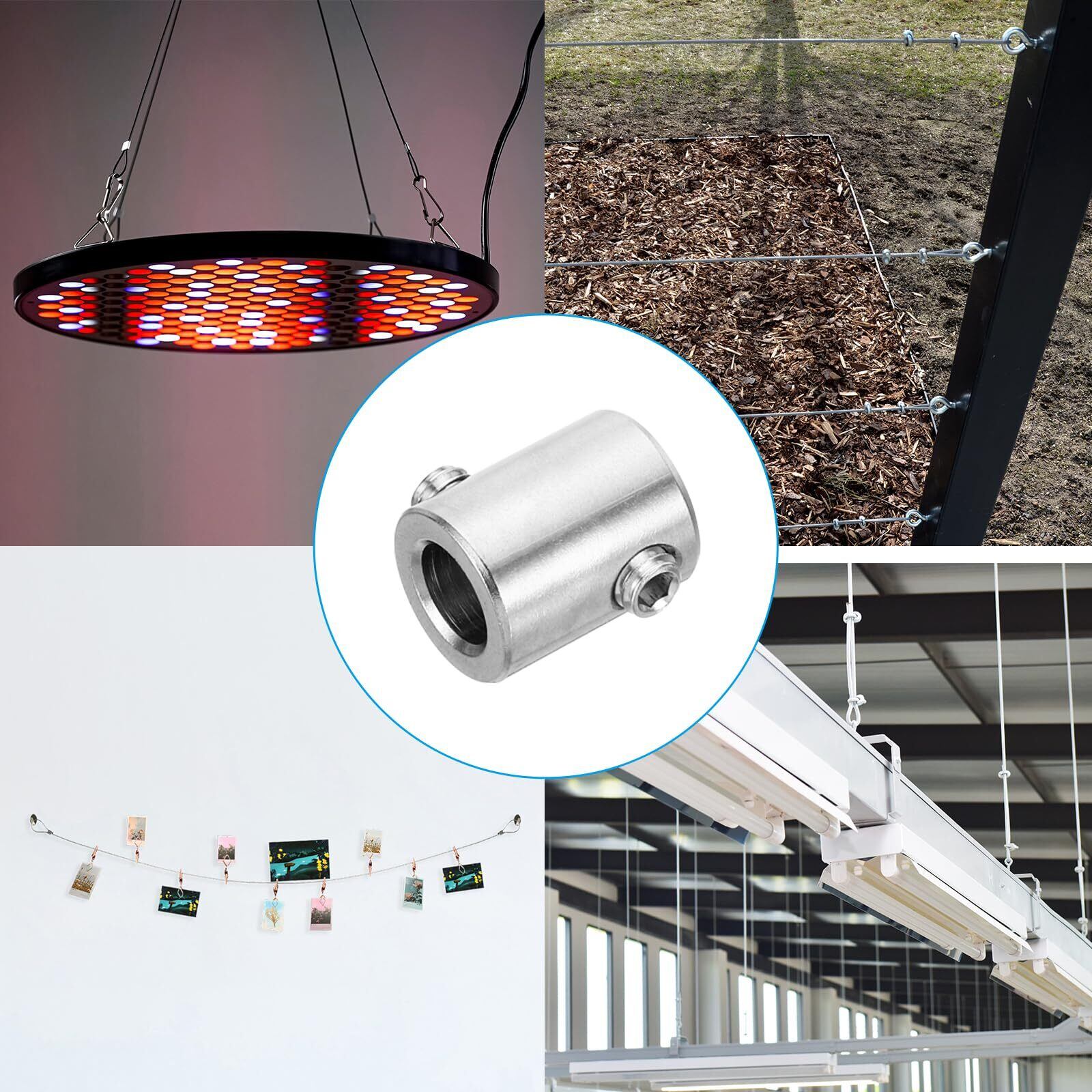 仕様:カラー:シルバー;素材:304ステンレススチール;ねじサイズ:M5;クリップホール直径:5mm / 0.2";全体サイズ:10 x 12 mm / 0.39 x 0.47"(OD*L);梱包リスト:ワイヤーロープクリップ4個、六角ソケットスクリュー4本、スパナ1本