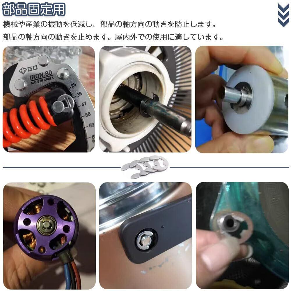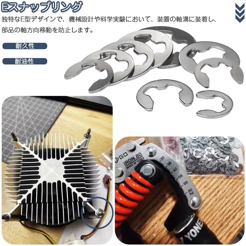 セット内容:E型スナップリング120個セット(1.5mm (12 pcs),2mm (12 pcs),3mm (12 pcs),4mm (12 pcs),5mm (12 pcs),6mm (12 pcs),7mm (12 pcs),8mm(12 pcs),9mm (12 pcs),10mm (12 pcs)。)材質:304ステンレス鋼 収納ケース付き。
