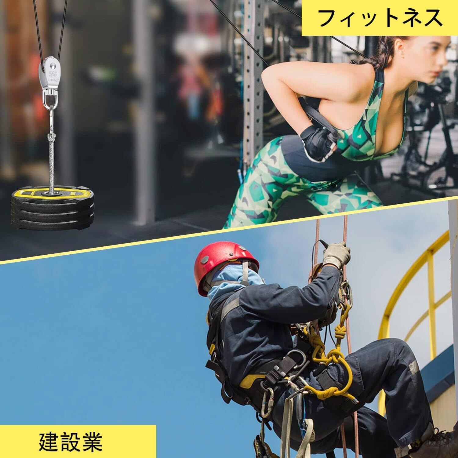 【360度回転】:滑車は360度回転し、向きを変えることが簡単で手間が省けます。また、ロープの絡まりを防止する機能もあります。