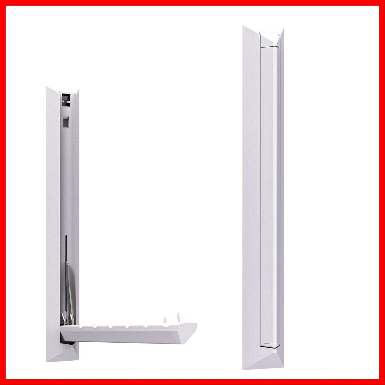 ”特長:”石膏ボード壁に取付けられる壁面物干し。使わないときはアーム部分をスッキリ収納。