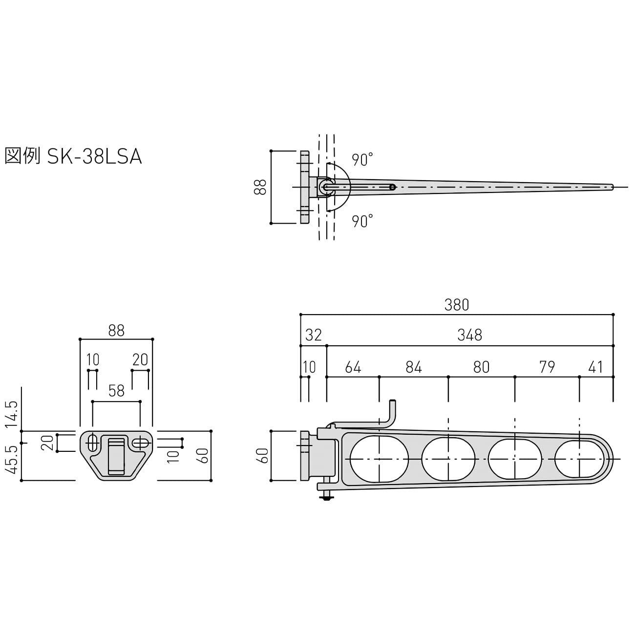 バルコニー物干金物(横収納型) 新協和 SK-38LSA 1セット2本組販売(アーム長さ水平時380mm)アーム横収納型・横型ブラケット 品番・品名/新協和 横収納型 SK-38LSA 1セット2本組 カラー/ホワイトクリーム・ダークブロンズ 仕様・材質/横収納型・横型ブラケット(アーム長さ水平時380mm)/アルミダイカスト製 特徴 ● 不用時は竿を竿受け金具に収納し、本体を持ち上げて回転させて収納します。注意事項1セット2本組販売です。必要セット数にてご注文お願いします。 物干し本体のみで、取付ビス、物干し竿などは含まれません。