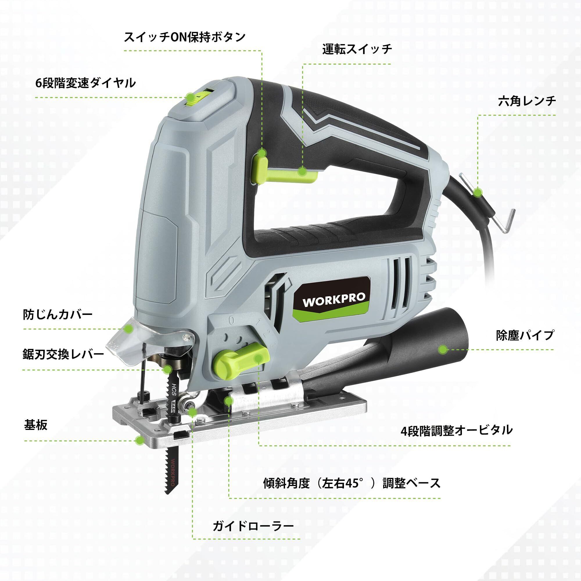 WORKPRO ジグソー 電動ジグソー 600W 傾斜 曲線切断 ダイヤル式6段変速 オービタル4段階調節 ワンタッチ切替 木材 プラスチック 金属切断用 除塵 吸引・吹き出し掃除機能 透明保護カバー付き ブレード7本&定規付き 木工 DIY作業 取扱説明書付き
