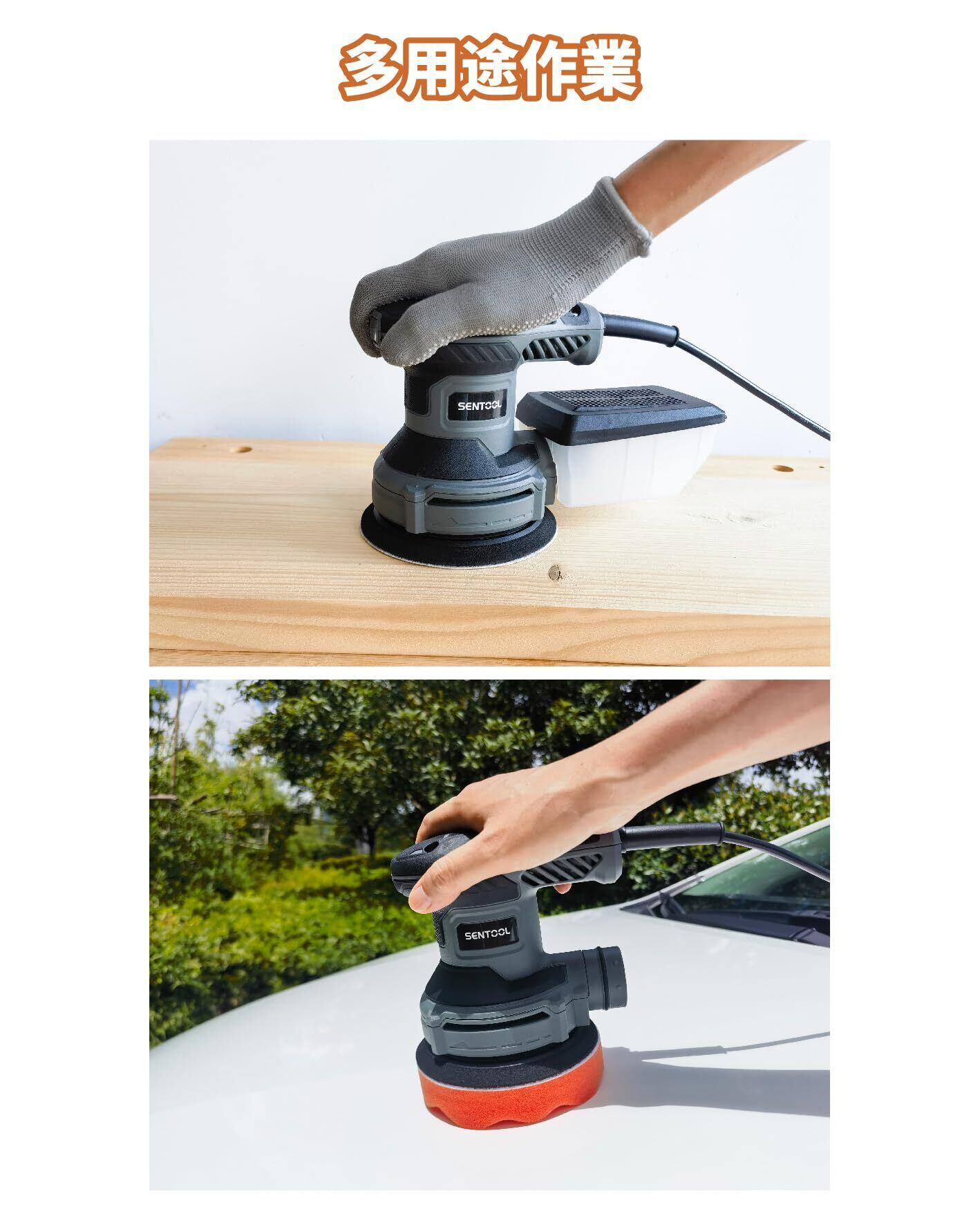 「多用途作業」回転運動+偏心運動で研削ムラの発生しにくい、ランダムオービットサンダ。木工、金属、プラスチック製品などの研磨作業、自動車のワックスがけ、艶出しなどいろんなシーンでこ、一家に一台あると大変役立つ電動ヤスリです。