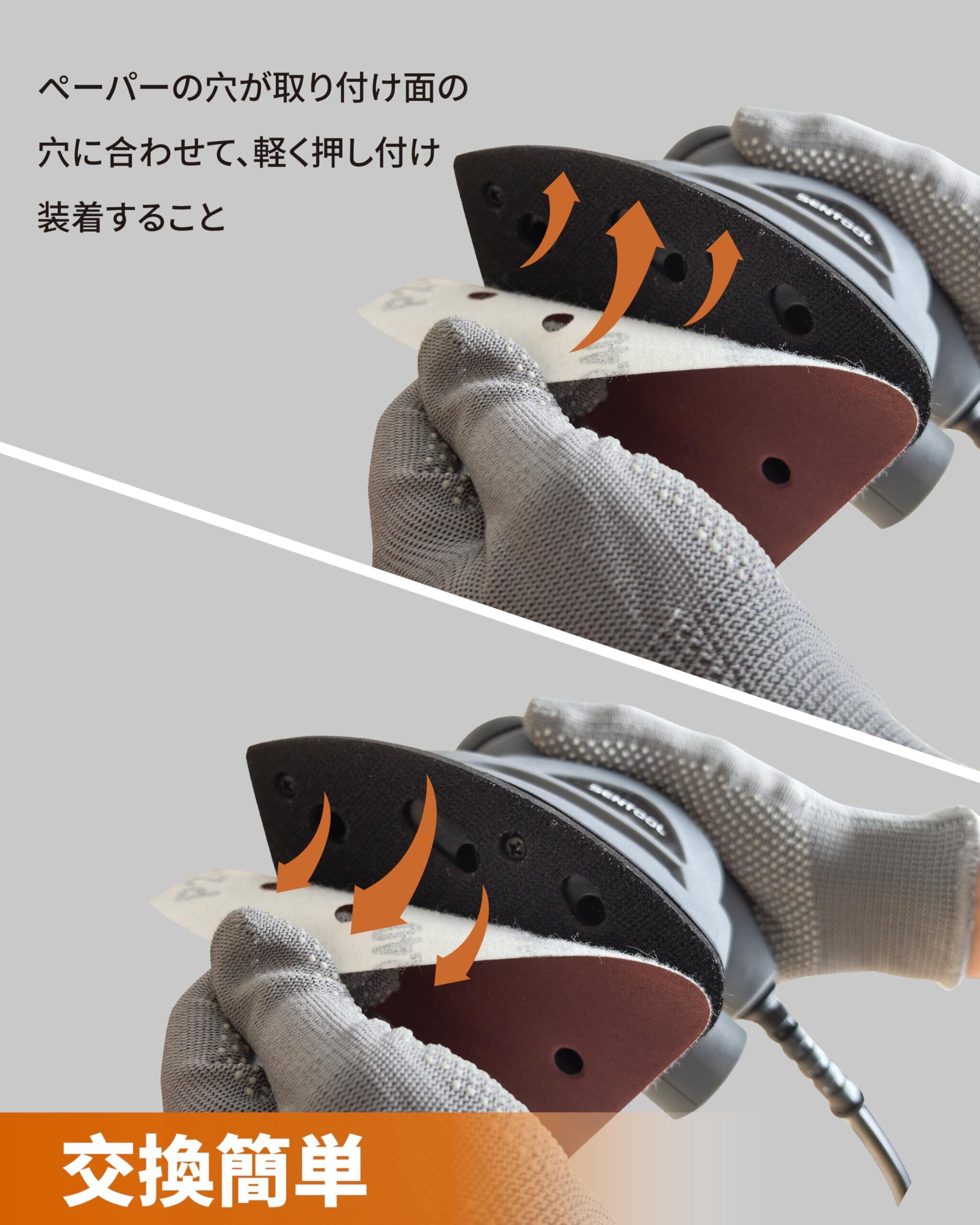 「マジックテープ式で」面ファスナー式サンディングペーパーで交換が簡単。付属サンディングペーパー#60/120/240×各6枚。