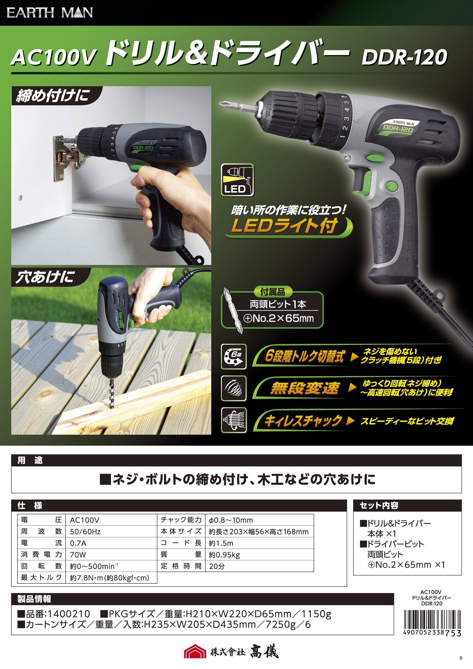 【人気商品】高儀(Takagi) LEDライト付 ドリル&ドライバー EARTH MAN AC100V DDR-120 ブラック【キィレスチャックでスピーディーなビット交換】 電動ドライバー 電動ドリル ドリルドライバー インパクトドライバー 電動ドリルドライバー 穴あけドリル ドライバー電動 | metta