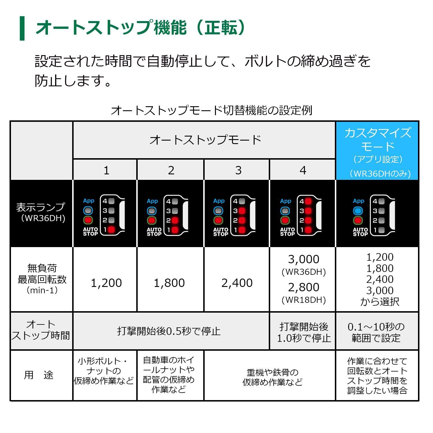 あらかじめ設定された時間・回転速度に自動で停止・変速し、ナットの脱落や締めすぎ防止に役立つオートストップ・オートスロー機能搭載。