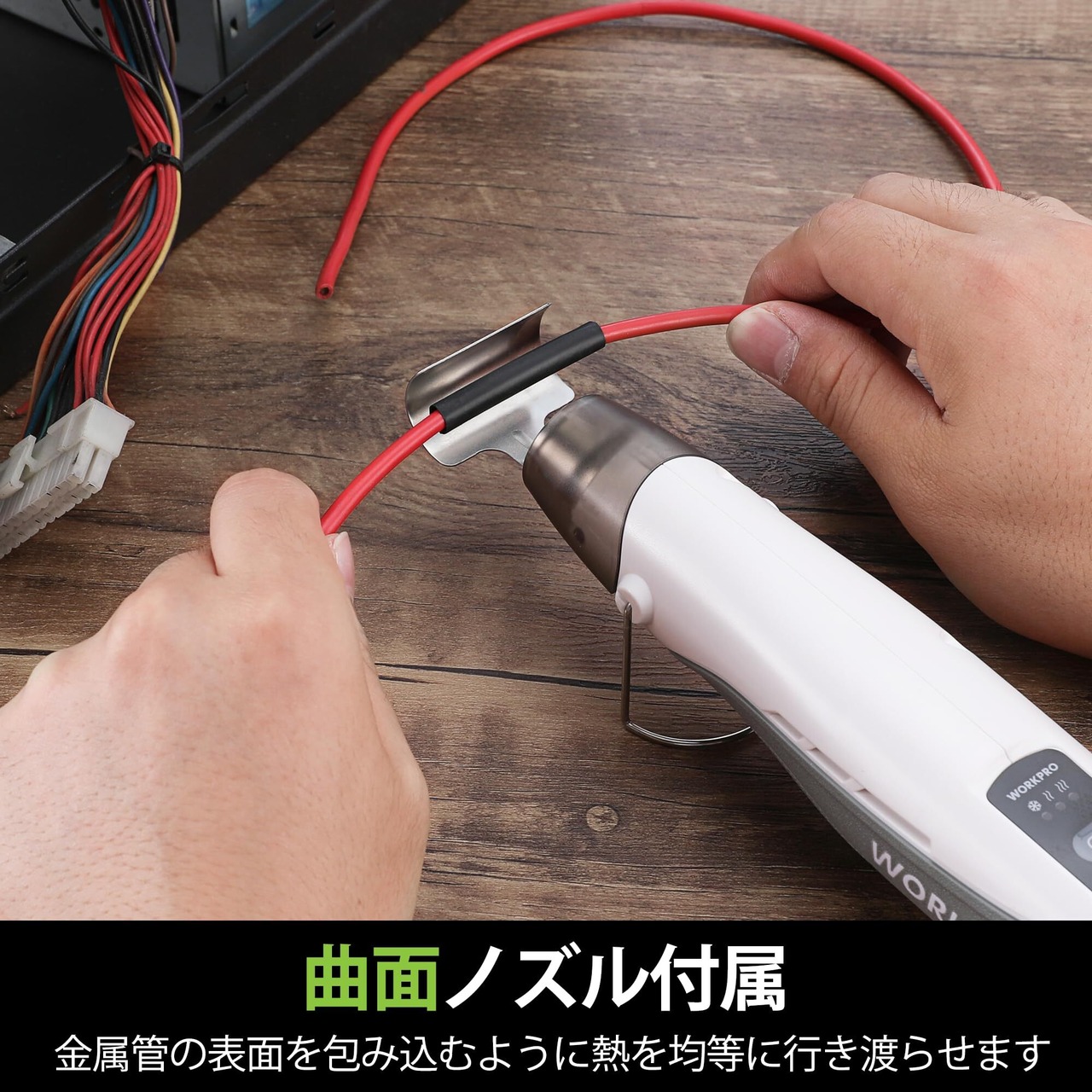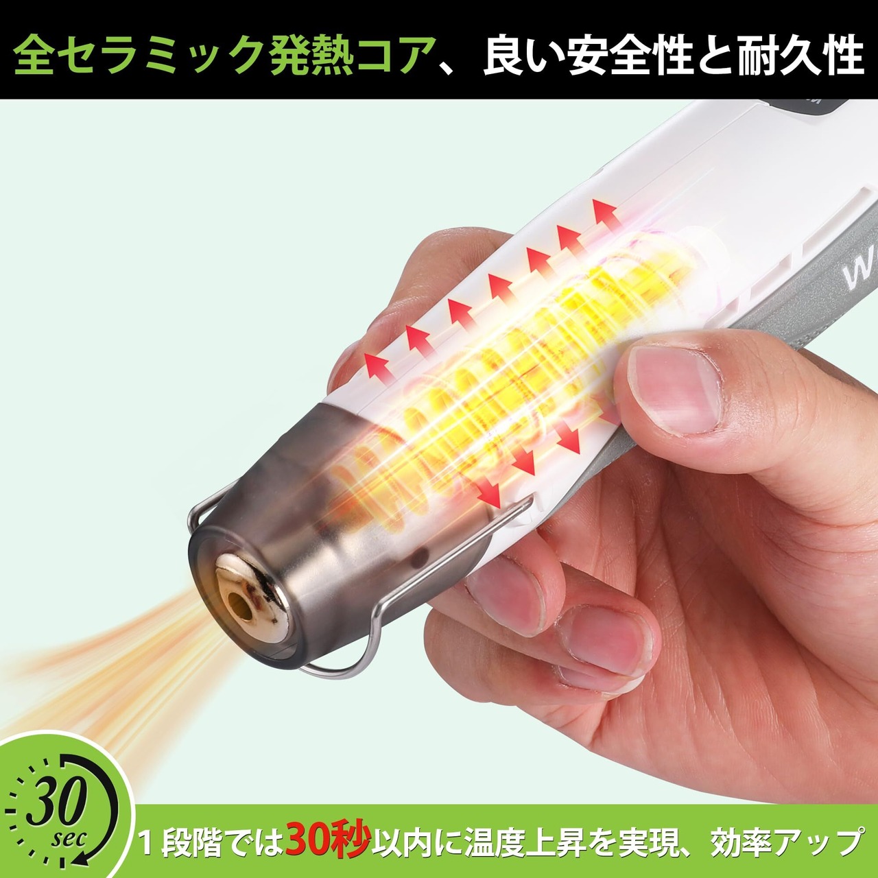 【急速加熱 】高品質のセラミック発熱コアにより、30秒以内に150℃まで一気に上昇。短時間で作業効率を大幅にアップします。特にDIYや精密な作業に適しており、迅速な熱処理が可能です。熱収縮チューブの加熱、ケーブルの溶接、パテの乾燥、塗装やシールの剥がし作業、収縮性フィルム、エンボスパウダーなど様々な使い道があります。