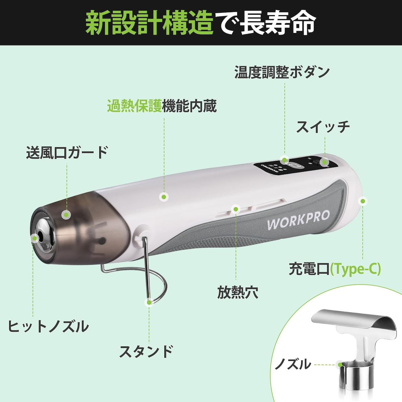 WORKPRO ヒートガン ホットガン【コードレス】小型タイプ 8V ミニヒートガン USB充電式 2段階加熱可能 150℃-360℃急速加温 充電ライト付 過負荷保護 レジン気泡とり ステッカー剥がし 補修 熱処理 乾燥 エンボス DIY 手芸用 熱工具