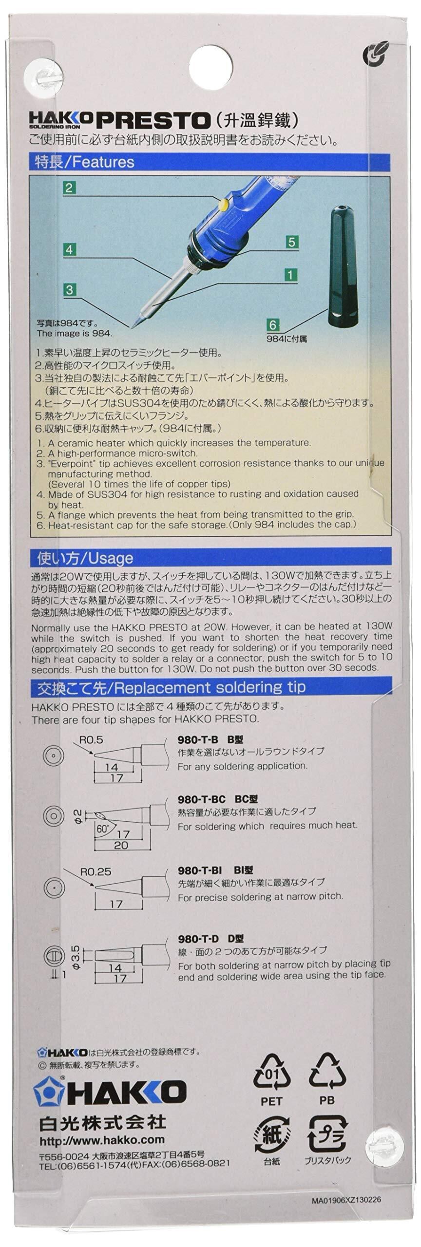 白光(HAKKO) PRESTO 急速加熱はんだこて 20/130W(スイッチオン時) 耐熱キャップ付き 984-01