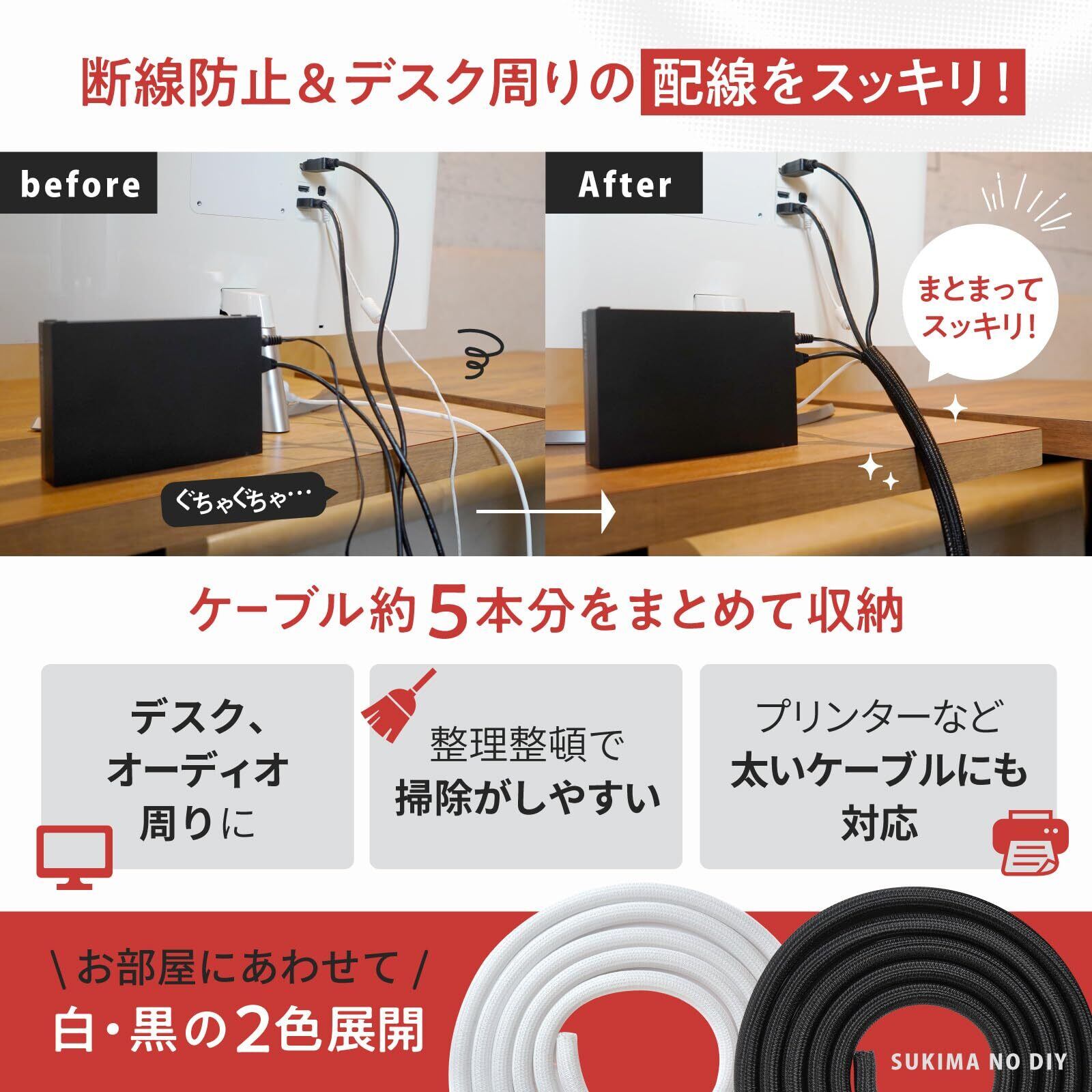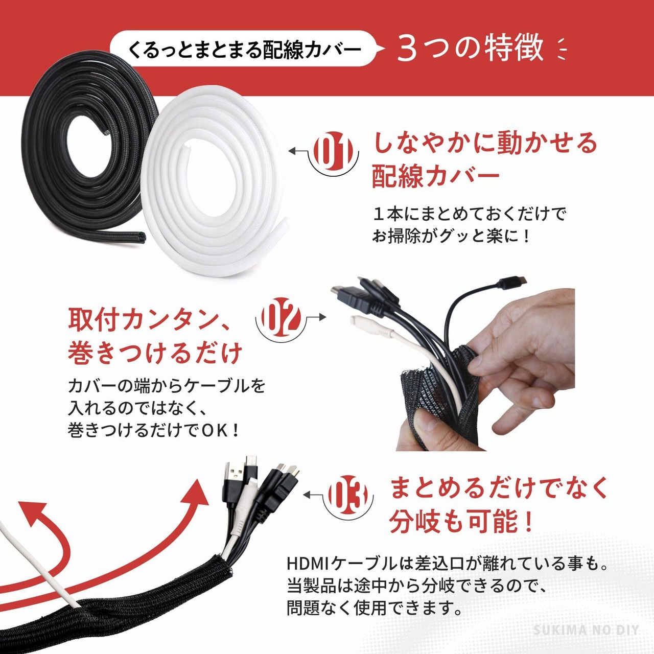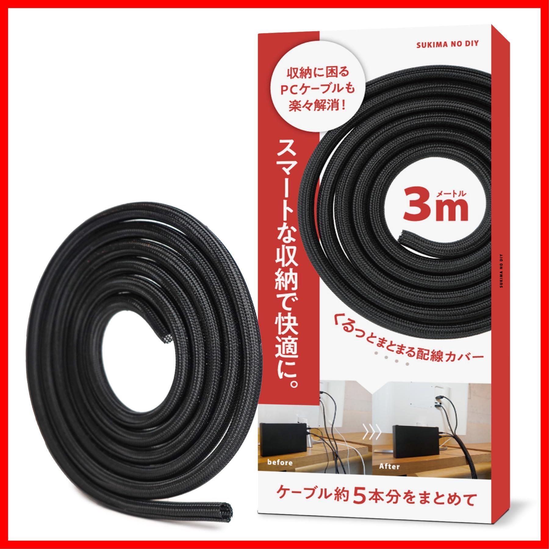 【整理整頓&噛み防止 コード5本分収納】くるっとまとまる配線カバー (黒色) 配線隠し 噛み防止 ケーブルカバー 配線カバー コンセントカバー デスク オーディオ PC周り 3m 直径16mm