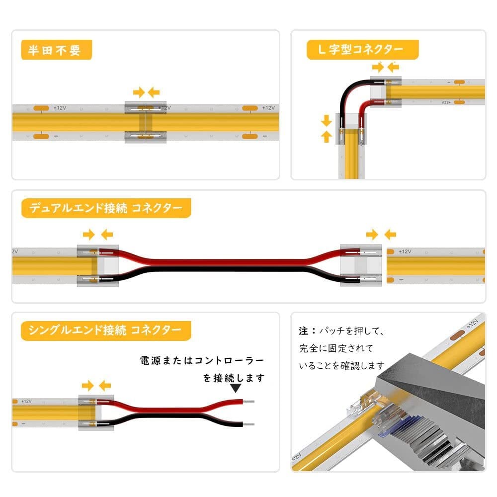 このFCOB LEDコネクタを使用すると、FCOB LEDテープライトを自由に切断できます。これらのアクセサリを使用すると、テープライトを延長して接続したり、テープライトとコントローラーまたは電源の間の接続を延長したり、コーナー接続を実現したりできます。