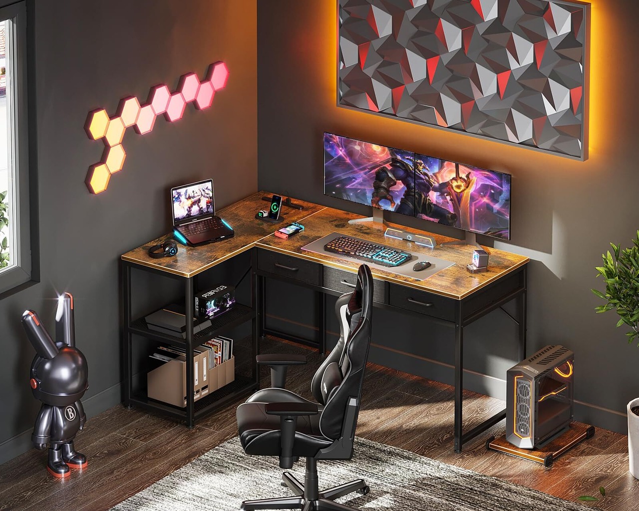 ODK ゲーミングデスク 引き出し3杯 パソコンデスク コンセント付き l字デスク デスク 机 幅135 pcデスク 棚付き 収納 desk オフィスデスク 在宅勤務 仕事用 組立簡単 ビンテージ