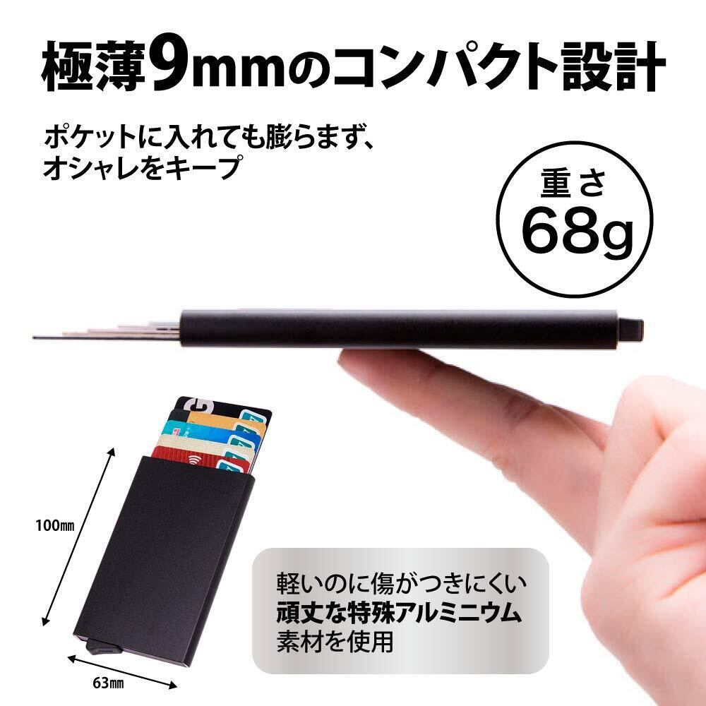 『安全・極薄・軽量!』極薄9mmのコンパクト設計にも関わらず、最大9枚のカードを収納可能。ジャケットの胸・腰・内ポケットに入れても膨らまず、常にオシャレをキープできます!ストレスフリーな状態でビジネス、プライベート等のシーンを問わずにお使いいただけます。用途に合わせてカラーを選べるのでプレゼントにも喜ばれる一品です。