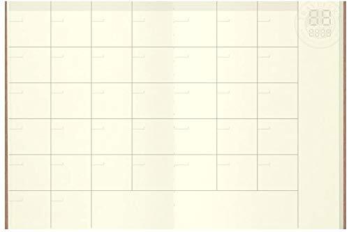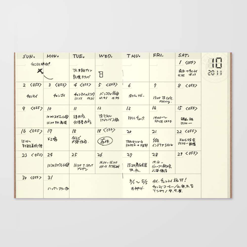 トラベラーズノート「パスポートサイズ」用の「月間ブロック」のリフィル。日付が入っていない自由な月間ダイアリーなので、何月からでも使い始められます。月曜始まり、日曜始まり、どちらでも使用が可能。