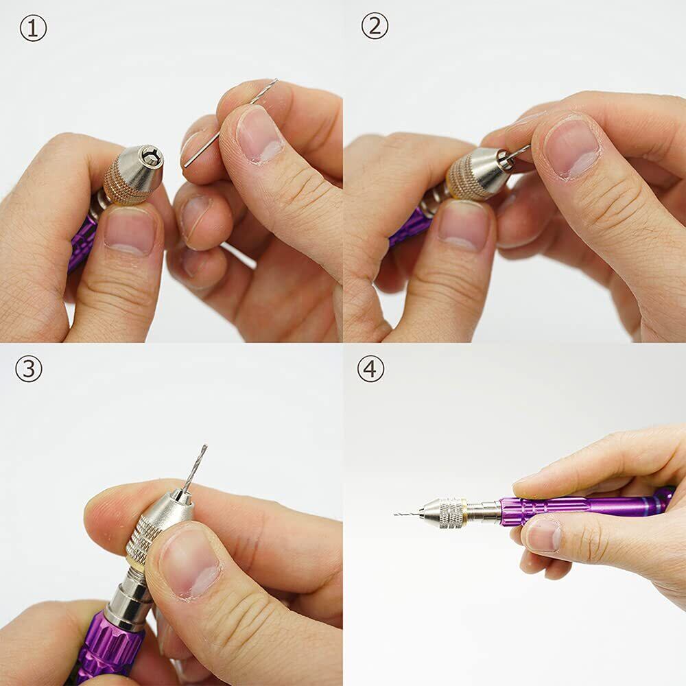 使い方:お尻の部分を手の平に当てるようにし固定します。ドリルに近い部分を親指と人差し指でつかんで、穴をあける位置にドリルの先を当てて、垂直に力を入れてくるくると回します。(※0.6mm、0.7mm、0.8mm、0.9mmなど細いドリル刃を利用する場合、適当に力を入れて、ゆっくりと回すことが必要です。あまりに力を加えると、ドリル刃が折れる可能性があります。)