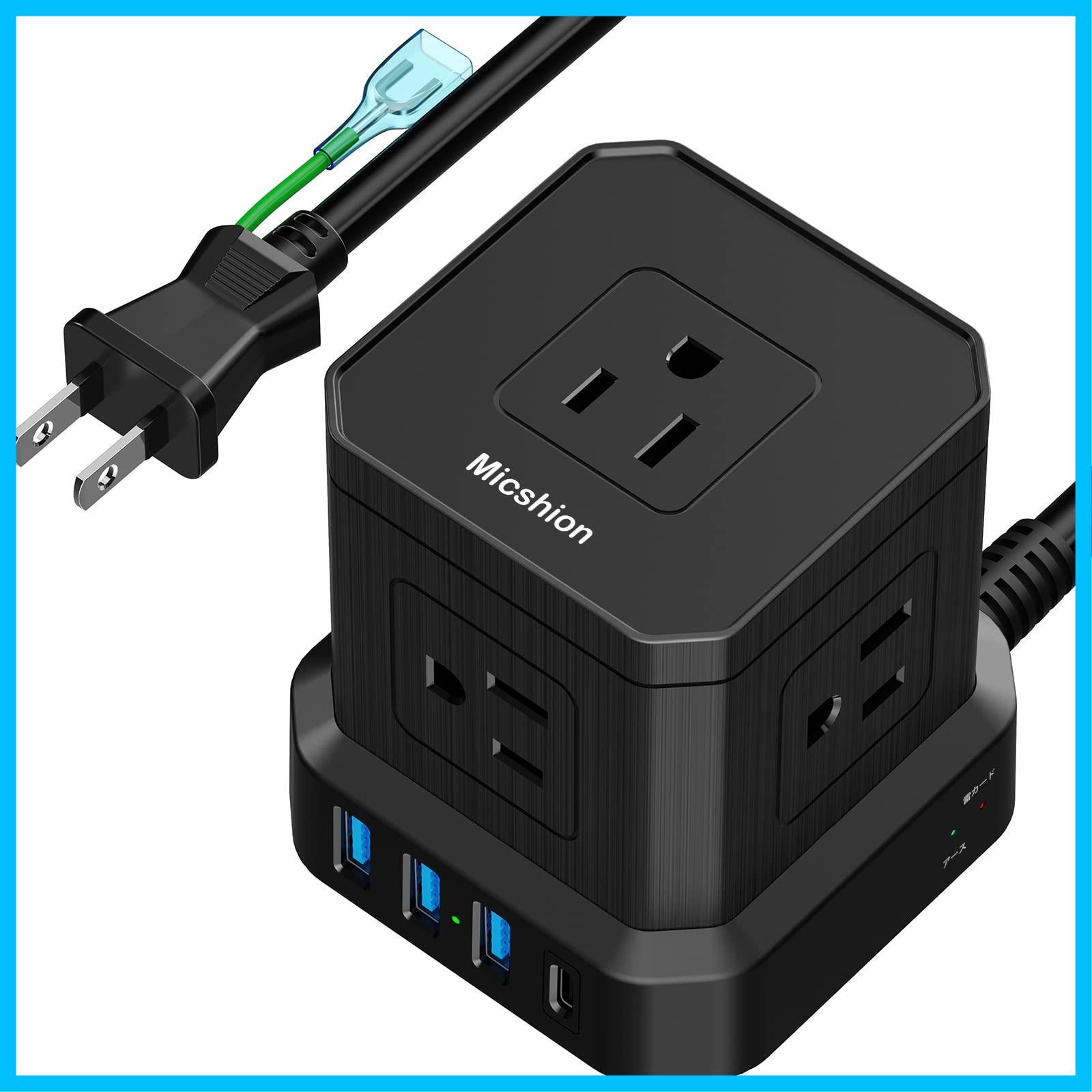Micshion キューブ型電源タップ Type-C付 延長コード 2m 雷ガード 5個AC口(2400W) 3個USBポート 1個Type-C コンセントusb付き 電源タップ usb付き タコ足配線 テーブルタップ たこあしコンセント マルチタップ 安全保護機能 自宅用 会社用 ブラック