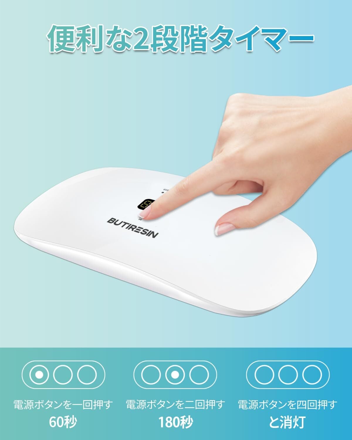 【便利な2段階タイマー】 60・180 秒、ボタンの押し方だけで簡単に切り替えられます。 ボタルを一回押すと、60秒の照射時間を設定する ボタルを二回押すと、180秒の照射時間を設定する、再び押すと、電源オフする。