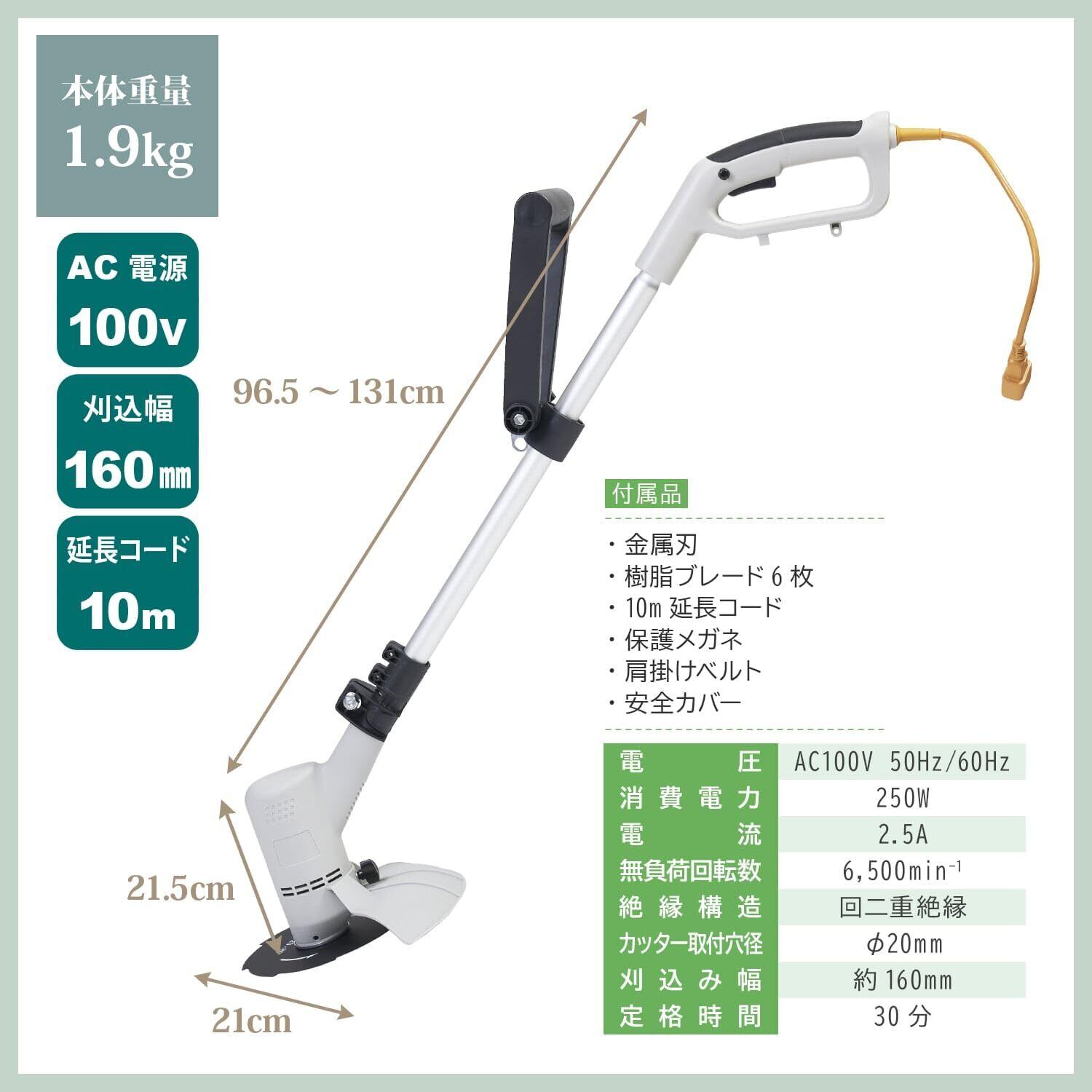 【仕様】本体サイズ:幅21×奥行96.5~131×高さ21.5cm/本体重量1.9㎏/電圧:AC100V 50/60Hz/消費電力:250W/電流:2.5A/定格時間:30分/無負荷回転数:約6000min-1/絶縁構造:回二重絶縁/カッター取付穴径:20mm/金属刃寸法:長さ160㎜×8P(内径20mm)/樹脂ブレード寸法:長さ160㎜/内容:草刈機本体、金属刃1枚、樹脂ブレード6枚、保護メガネ、肩掛けバンド、10ⅿ延長コード、六角棒レンチ、ボックスレンチ、コードストラップ、ベルトフック、取扱説明書