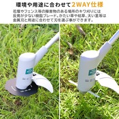【特徴】AC電源タイプの電動草刈機です。コンセントに挿すだけですぐに作業開始でき、充電切れの心配もありません。太い草も刈れる金属刃と、庭木や塀などを傷つけにくい樹脂刃の2種類の刃を付属。用途に合わせて使い分けることが出来ます。伸縮ポールで身長に合わせた長さ調整が可能で、持ち運びや収納時にコンパクトで便利です。ループハンドル付きでつらい体勢の必要なく、女性でも手軽に草刈りができます。ループハンドルをつかむ事でシャフトが短くなり姿勢が安定し、取り回しもラクラクです。安全ボタン式でボタンスイッチで誤作動を防止します。始動させる場合はボタンを押しながらスイッチを握ります。もちろん作業中はスイッチのみでご使用いただけます。