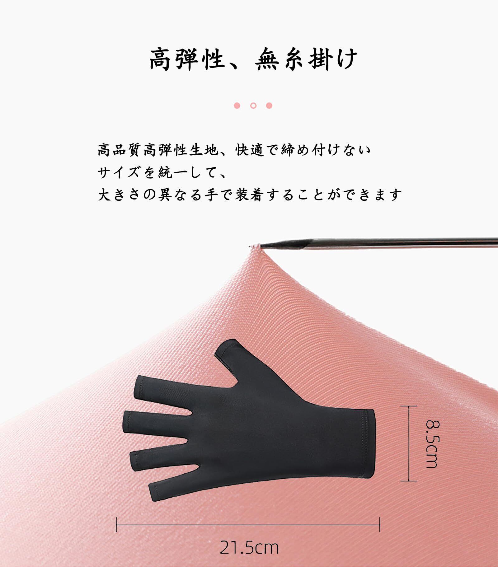 【商品の特徴】 ハーフフィンガーデザイン、ファッショナブルで実用的、携帯電話の操作や細かい作業に便。適用場面: 紫外線対策、 自転車、バイク、運転、スポーツ、働くこと、ジェルネイル 書くこと、肌の保護、寝ること、等