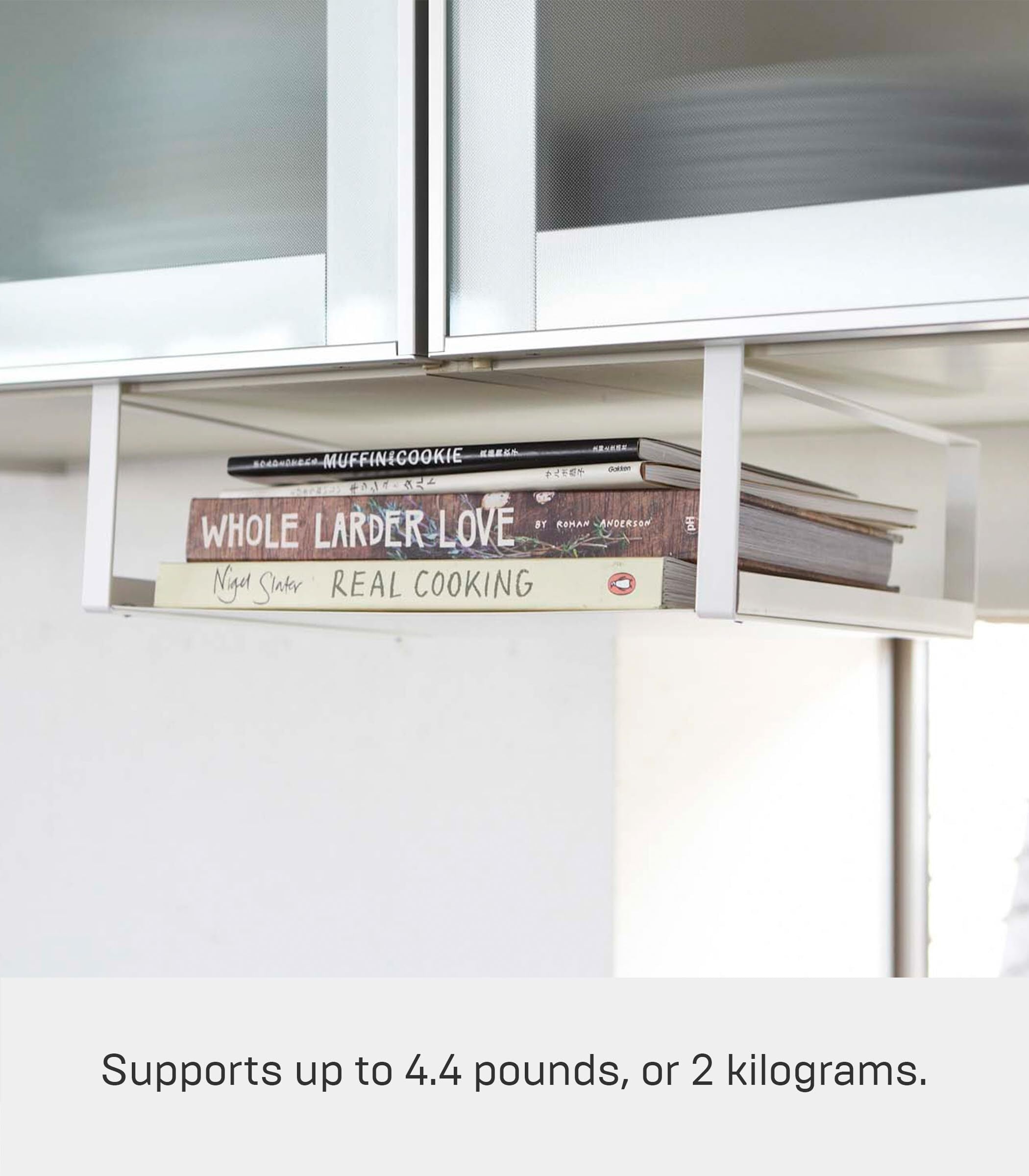 耐荷重が2kgあるので、フライパンやレシピ本など重たいものも収納可能です。