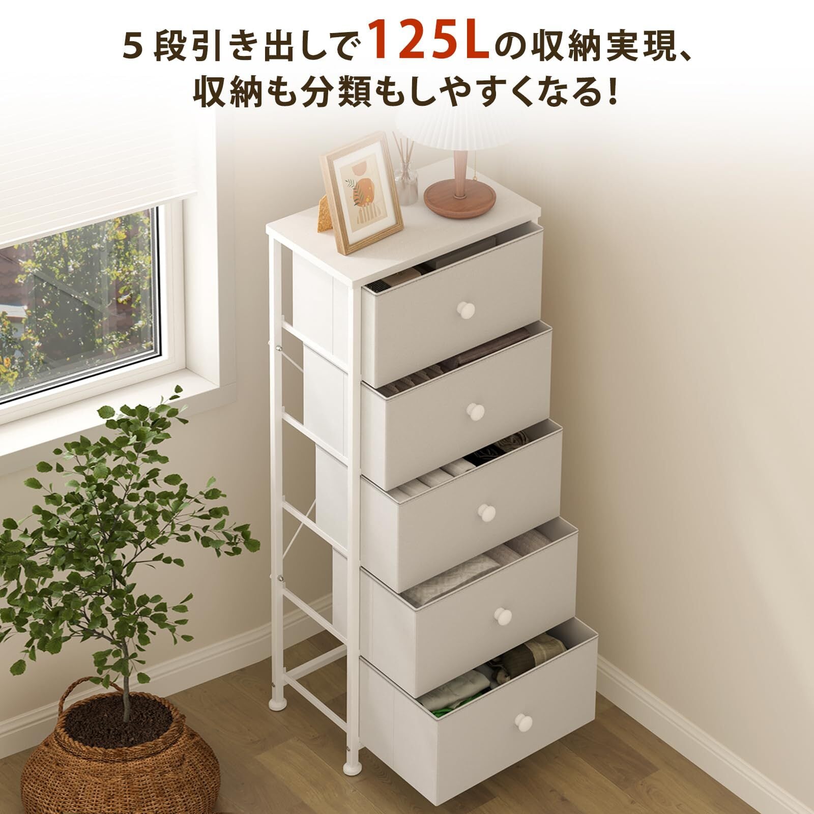 REAHOME チェスト 5段 タンス 収納 衣装ケース 大容量 ハイチェスト おしゃれ 衣類収納ボックス 引き出し ランドリー収納 木製天板付き 脱衣所収納 ファブリックチェスト 転倒防止 【幅45×奥行30×高さ112cm】(ホワイト)