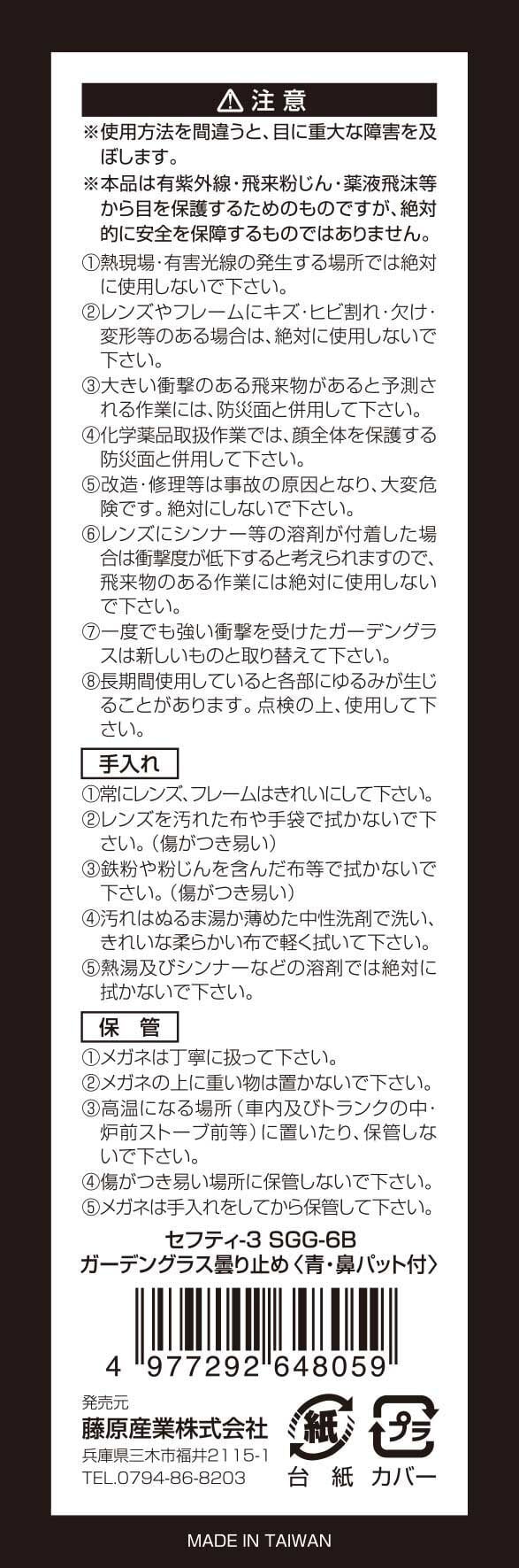セフティー3(Safety-3) ガーデングラス 青 UVカット 曇り止め加工 鼻パット付SGG-6B