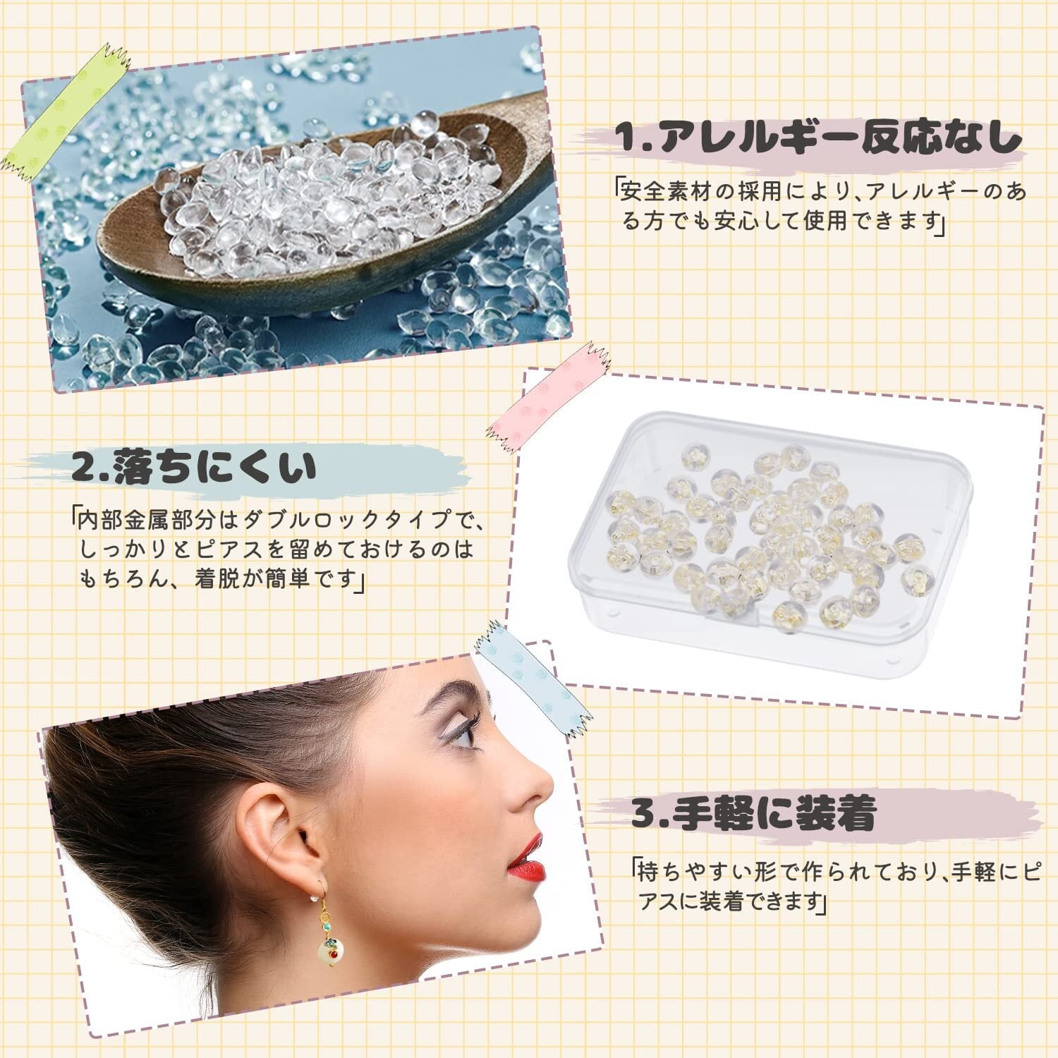 「金属アレルギー対応」高品質シリコンより作られたピアスキャッチの本体に驚くほどの透明感が出ます。ロック部分の金属もゴールドメッキで仕上げており、耐久性を持ちながらアレルギーを起こしません。金属アレルギーの方々も安心できます。
