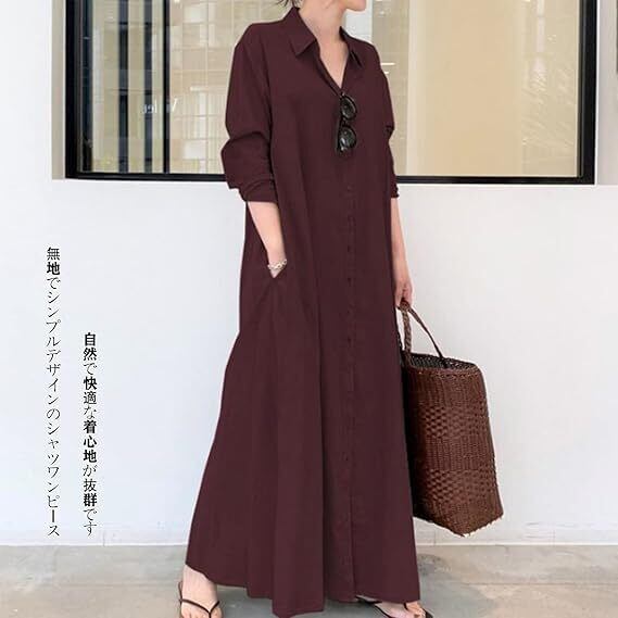 【前開きレディースロング フワンピース】お肌に優しい、しっかりとした綿混紡素材を採用。無地でシンプルデザインのシャツワンピース。程良く厚さで通気性が良く、自然で快適な着心地が抜群です。Aライン 体型カバーのマキシ丈ワンピースで、落ち着いたデザインなので、多くのシーズンでも着まわし出来ます。