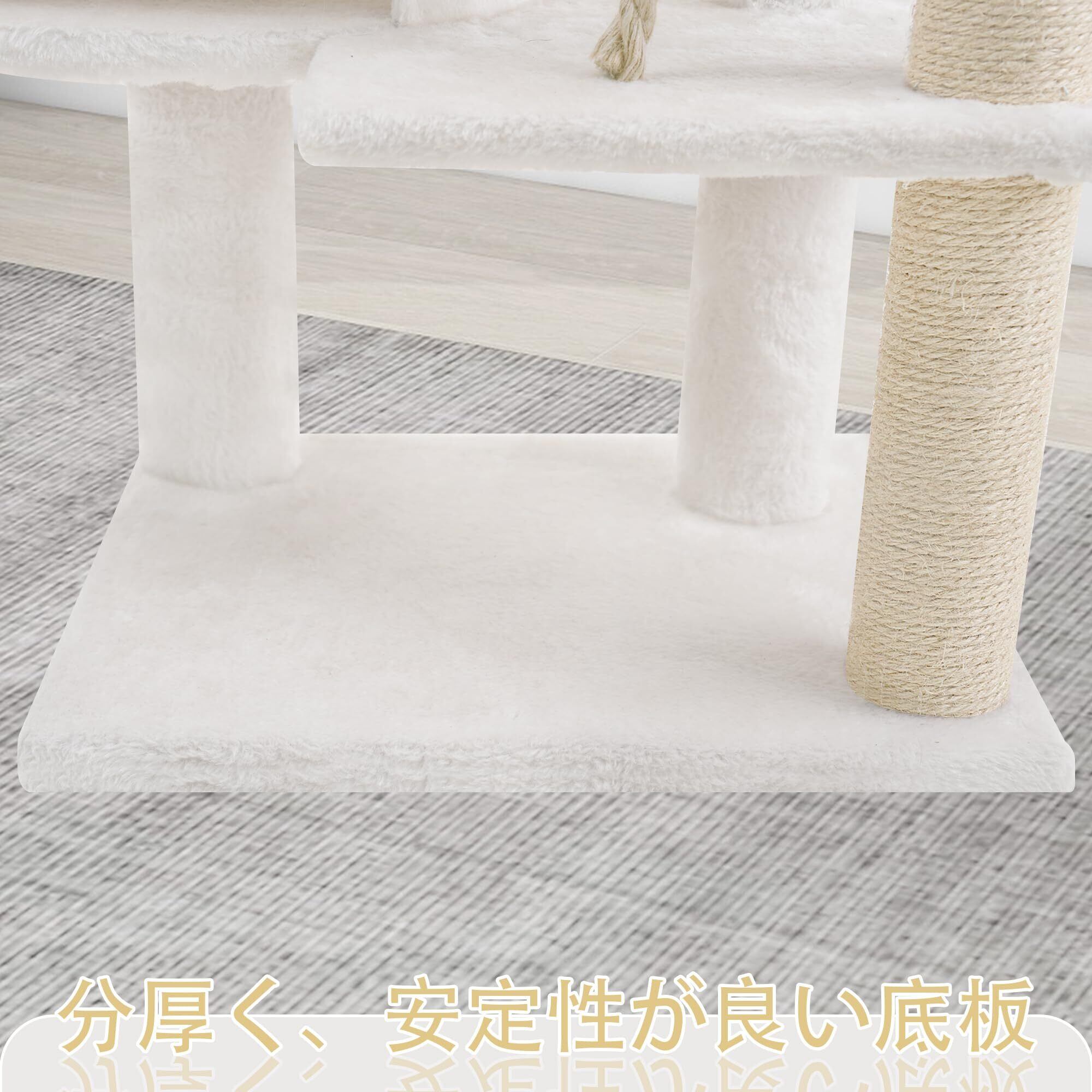 【上質な作り】しっかりと厚くしたベースは大きい猫ちゃんが遊んでも揺れにくいです。すべてのフロアが肌触りの良い素材で覆われています、6本支柱が全面麻縄巻き、見晴らし台の中にスポンジをいれますので、猫ベッドにもなります。
