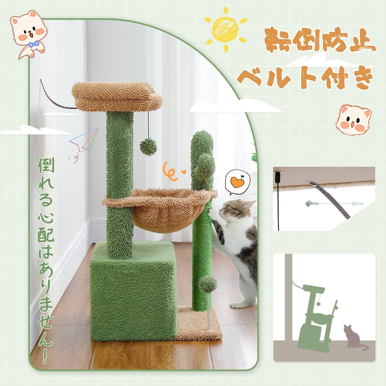 PAWZ Road キャットタワー ミニ 猫タワー サボテン 小型 低め 据え置き 人気 コンパクト 省スペース 麻紐爪とぎ ハンモック おしゃれ インテリア シンプル かわいい おもちゃ付き - 高さ80cm ベージュ