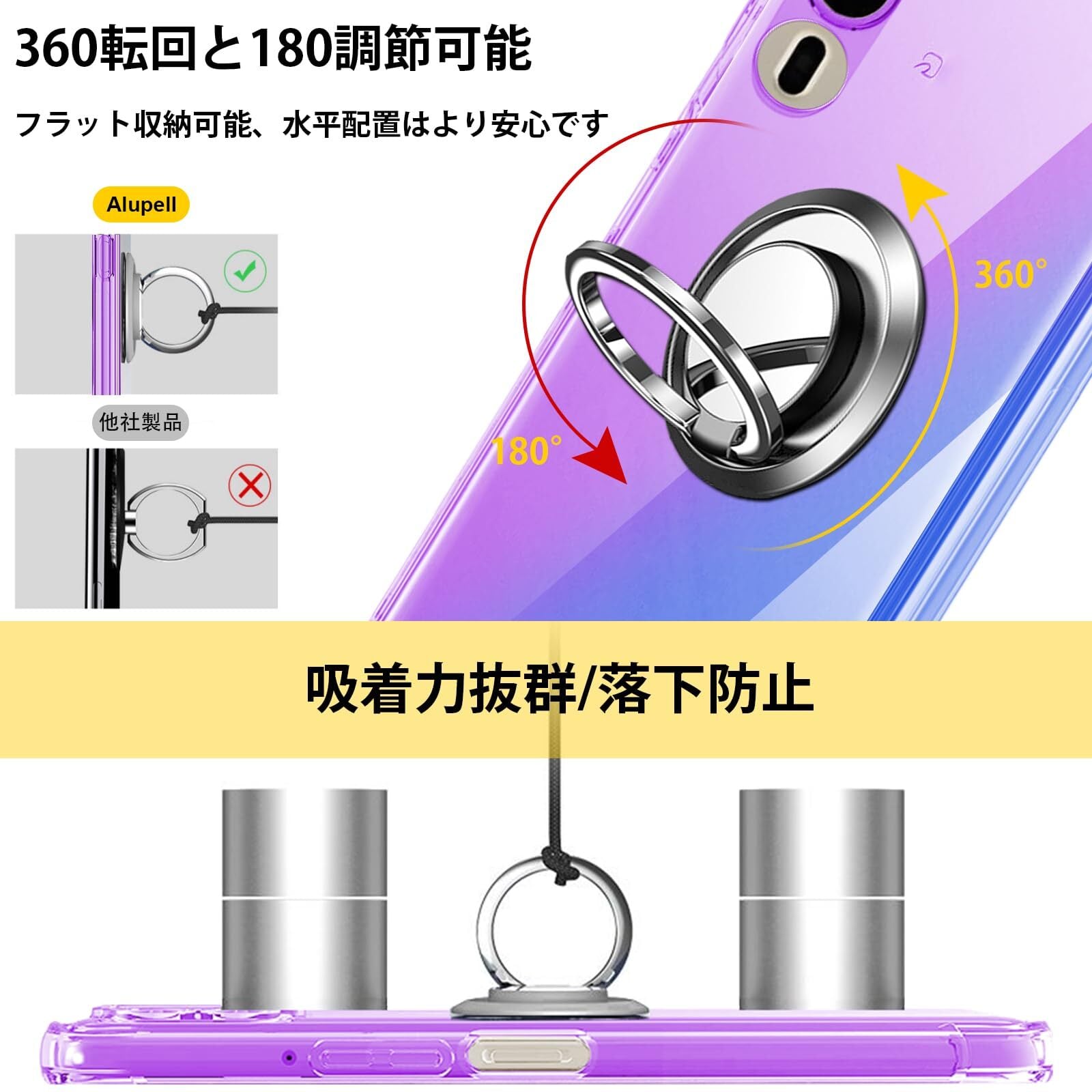 【360°回転】ブラケットは360°回転できます、垂直画面で小説を読むことができます、または、画面全体でビデオを見る。一指着る式で、指がリングに通り抜け、片手で携帯を操作でき、落下防止します。