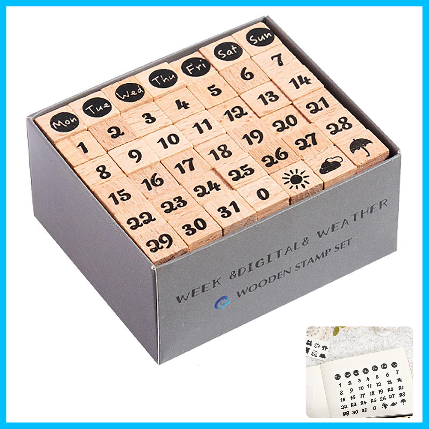 木製スタンプ 42個セット 数字&曜日 デコスタンプ 天気 日常 ハンコ ボックス入り 手帳 印鑑 Diy クラフト用 (数字&曜日)