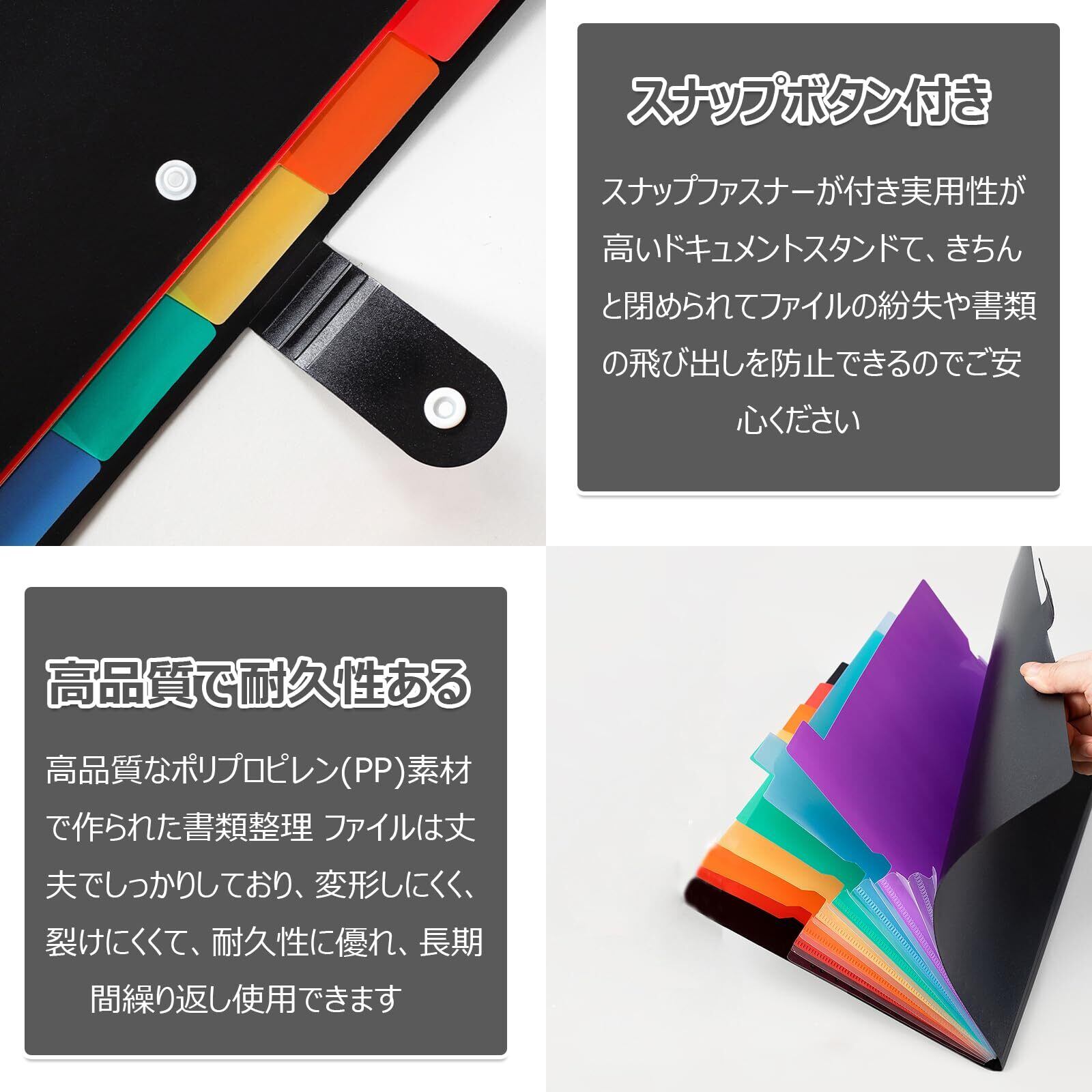 【仕分けファイル分類便利】ドキュメントファイルの内側はカラフルで、書類を色別に分類できます。また、A4 ドキュメントファイルにはラベルが付いており、、さまざまな書類を見つけやすく整理できます。さまざまな書類整理・小物分類に使用できます。高効率に勉強と仕事に役に立ちます。