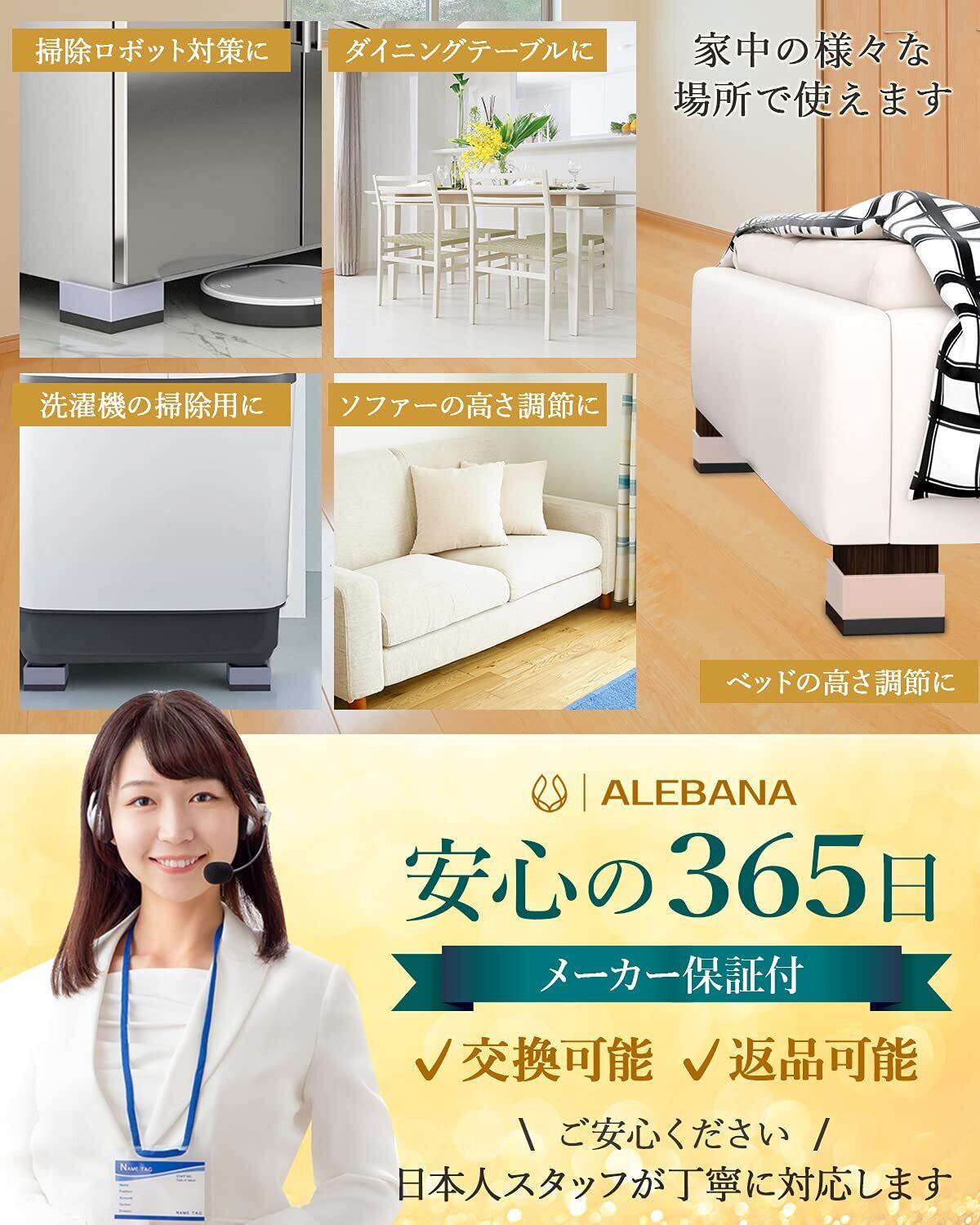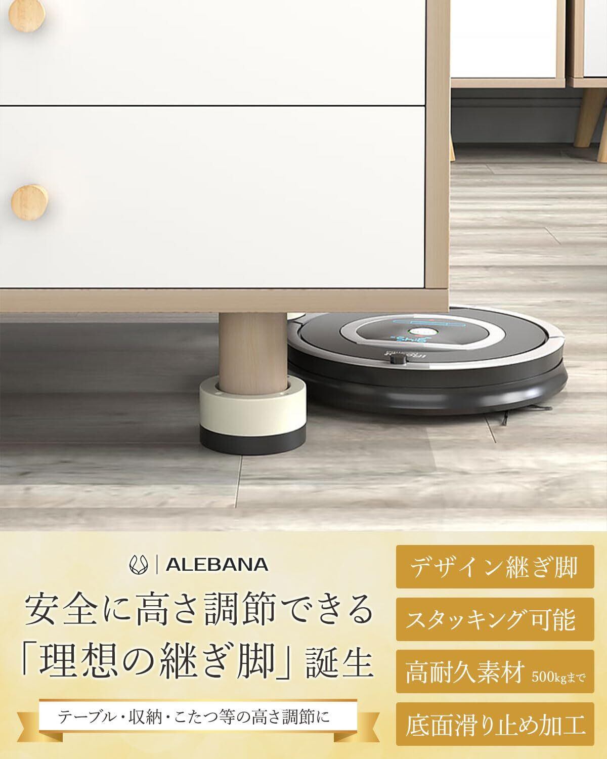 【2段階の 高さ調整 】 スタッキングが可能な2段のブロックタイプで、家具や用途に合わせて 調整 ができ、理想の高さを見つけられる 継ぎ足し です。本体には軽くて丈夫なポリプロピレン素材を採用。耐荷重は500kgと高耐久で、 テーブル や ソファー 、 ベッド など、あらゆる家具にお使いいただけます。 ※ 脚 がないタイプの家具には使用できません。 【高さを上げてもっと快適に】 机 の 高さ が合わず姿勢が悪くなったり、膝を曲げれない、 座椅子 に座りながらでは こたつ は使えないなど、お困りになった経験ありませんか? 机の高さ を調整することでリラックスして、くつろぐことができます。またベッドの高さを変えれば、収納スペースも確保でき、 ロボット掃除機 なども入る隙間もできる快適な生活を送ることができます。 【防滑設計】 床面にはTPUゴム素材を使用しました。 継ぎ脚 が滑らず、床に傷もつきにくく、防音効果も発揮します。家具面にも滑り止め加工を施し、抜群の安定感を実現しました。 ※家具を動かしたり、移動する際は、滑り止めが支点となり、落下やズレが生じる場合がございますので、ご注意ください。 【スタイリッシュなデザイン】 機能だけではなく、見た目にもこだわりました。円形の 継ぎ足し は見た目にもオシャレで、インテリアにも馴染むデザインです。 【商品仕様】 ○サイズ(白フチあり)直径:6.5cm、(白フチなし)直径:8cm ○素材:本体/ポリプロピレン、底面滑り止め部分/TPUゴム ○セット内容:4つ足分 ○ブランド:ALEBANA