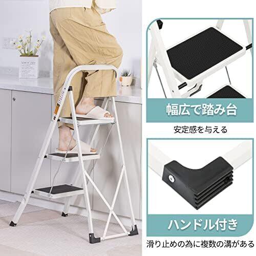 SPIEEK 脚立 鉄素材 持ち運び便利 持ち手付き 軽量 折りたたみ脚立 踏み台 滑り止め付き ステップ台 (ホワイト 三段)